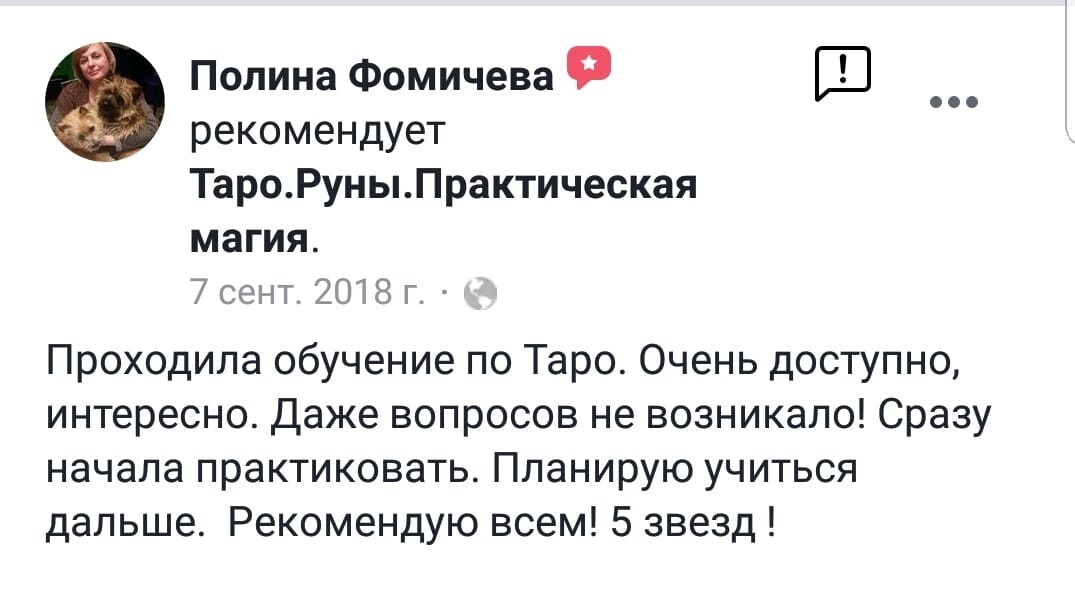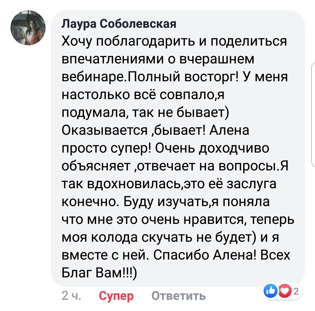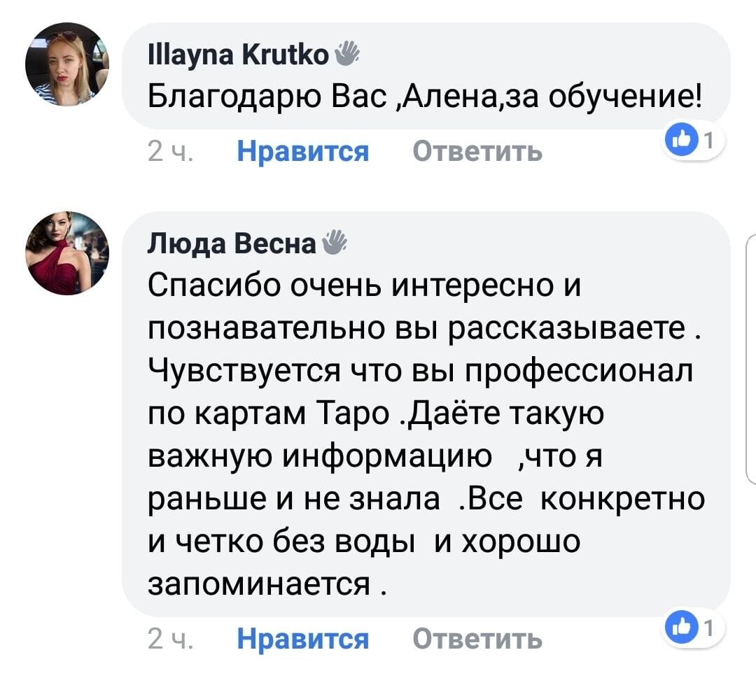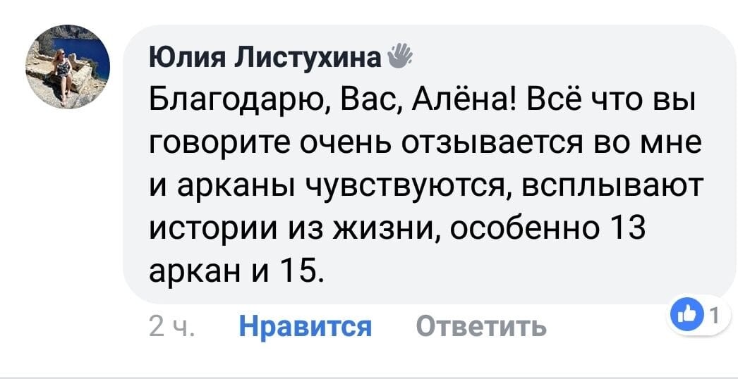 Алена!!! От всей души благодарю Вас за обучение!!! Давно интересовалась Таро, пробовала изучать сама, но думала, что это мне не дано. Но только, когда познакомилась с Вами и прошла сначала первый курс, поняла как я ошибалась. Сейчас практикую не только для себя ( а у меня пятеро детей и все хотят получить ответы ))). Я также начала практиковать и зарабатывать.
