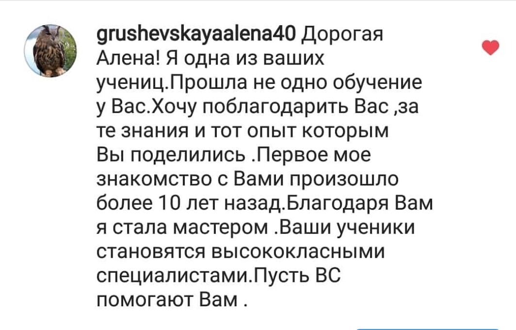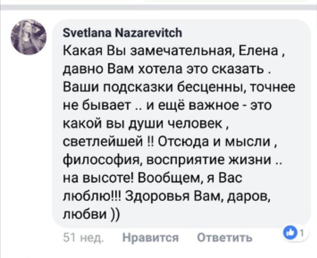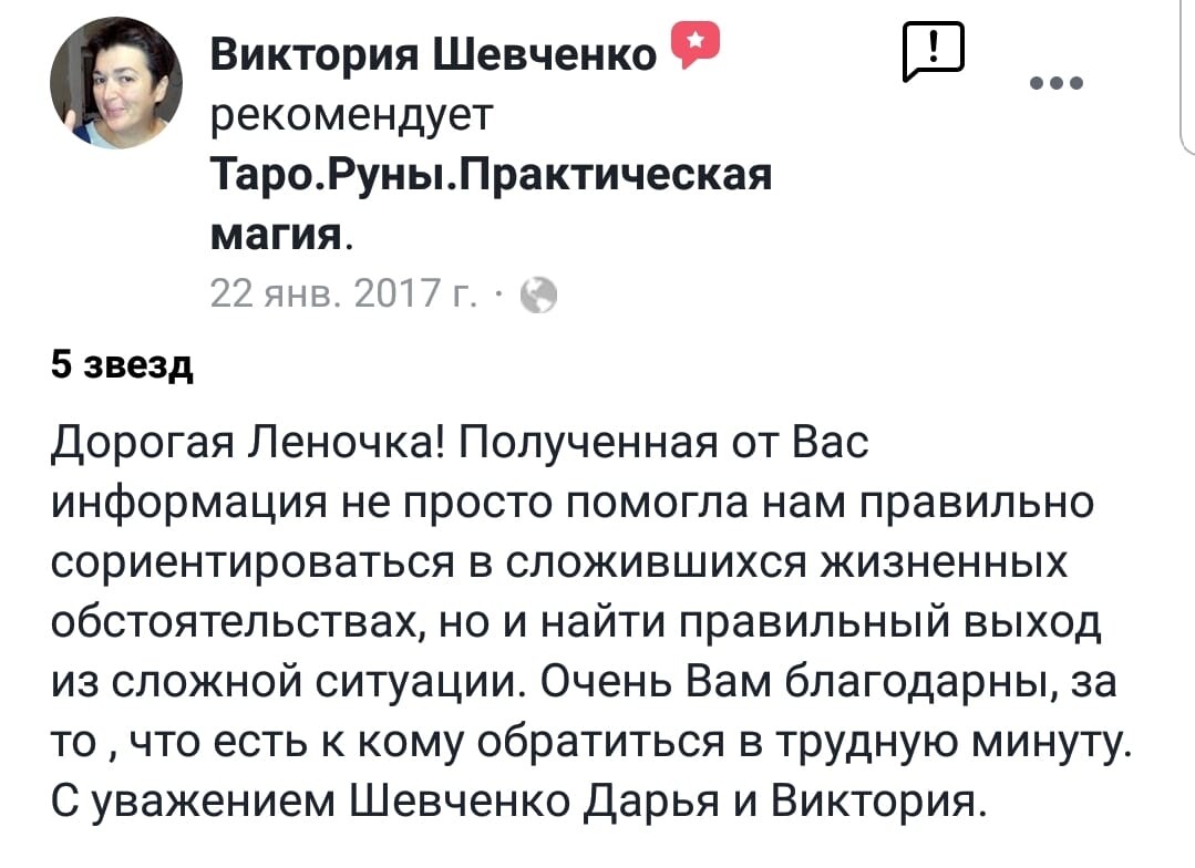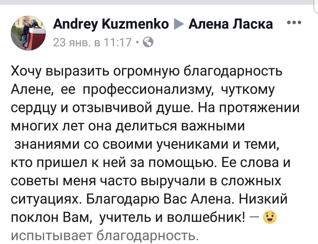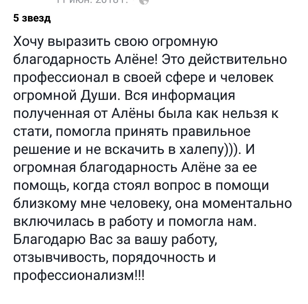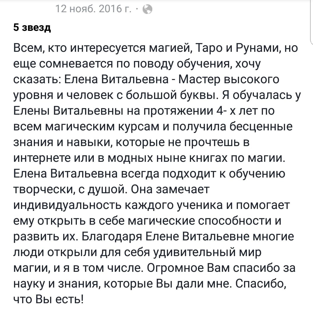 Огромная брагодарность Алене за то, что она кардинальным образом изменила мою жизнь в качественно лучшую сторону. 14 лет назад я пришла к Алене на консультацию, была в полном восторге. Потом начала интересоваться ТАРО, прошла у нее обучение. Сейчас я практикующий Таролог, нумеролог. Даже сама начала преподавать.